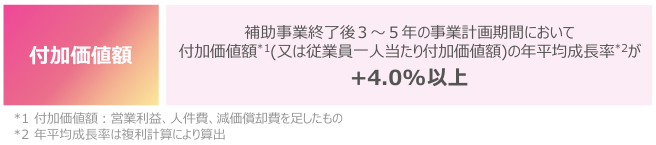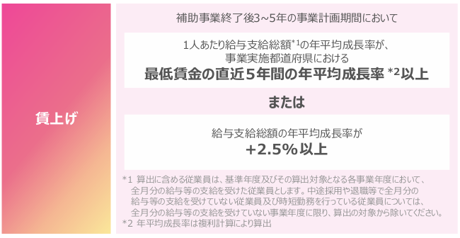 本補助金で最も難易度が高いのが、付加価値額の向上と賃上げ要件です。年平均付加価値4%成長と賃上げのどちらかの達成が必須となります。未達の場合は返還リスクもあるため慎重に設定する必要があります。