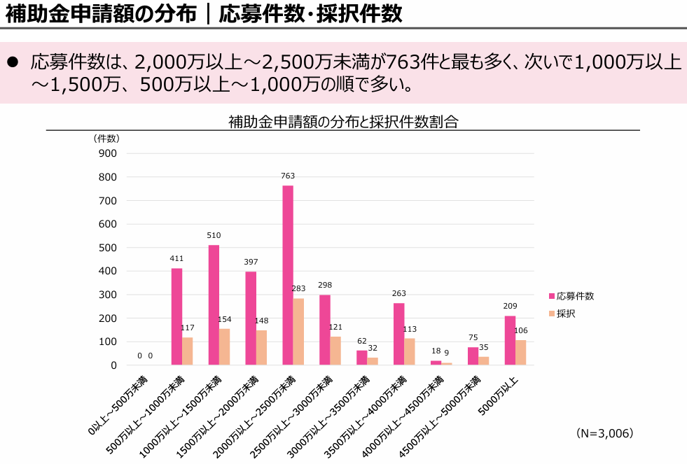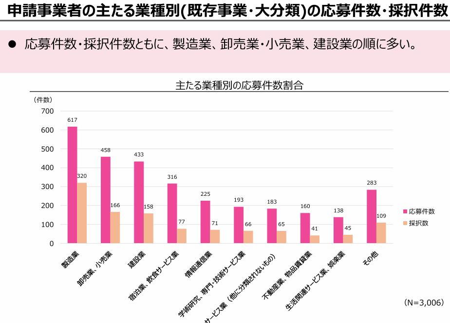 この補助金の第1回公募では、3,006件の応募があり、そのうち1,118件(37%)が採択されています。
