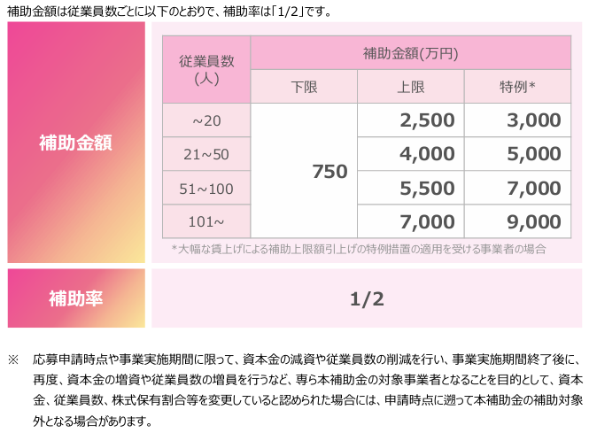 本補助金では企業規模に応じて上限額が設定されており、従業員数が多いほど上限額が高く設定されています。