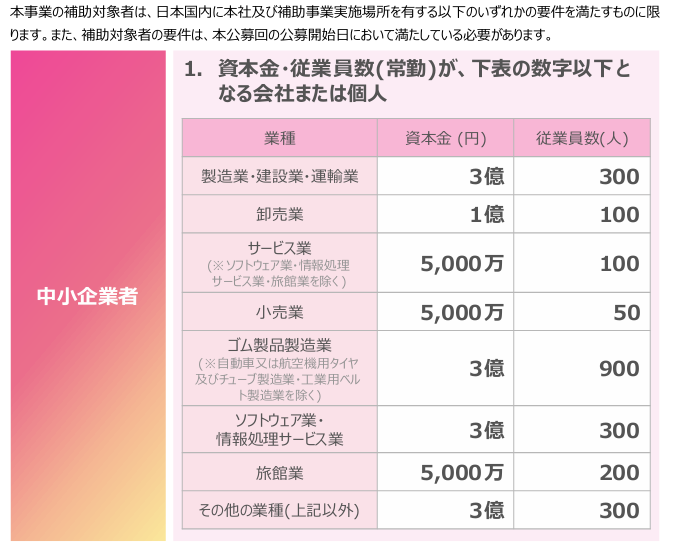 対象となるのは中小企業基本法に基づく「中小企業者」です。しかし、親会社の影響が強い企業(みなし大企業)や従業員ゼロの企業などは対象外となるため、自社の区分を確認することが重要です。