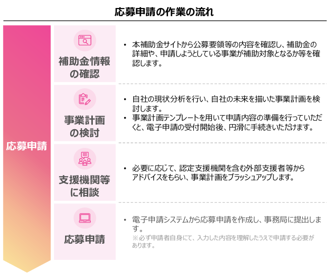 特に重要なのは「申請受付は11月10日から」という点で、事業計画書や行動計画の準備、GビズID取得などはそれ以前に完了しておく必要があります。
