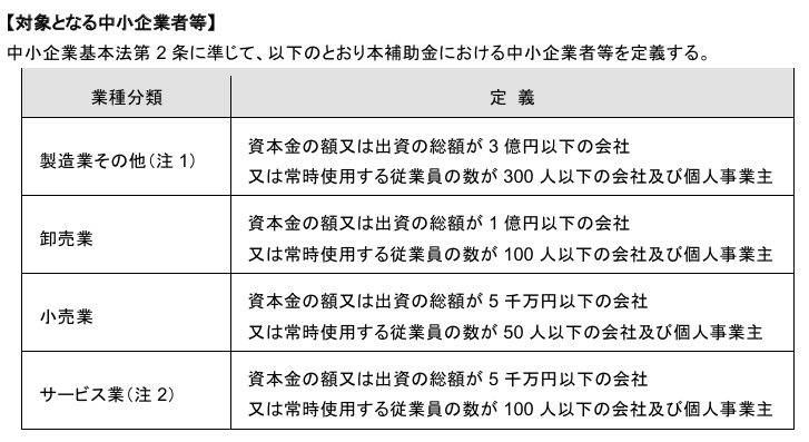 • 製造業・その他: 資本金3億円以下、または従業員300人以下。